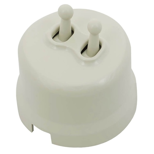 Пластиковый двухтумблерный ретро выключатель накладного исполнения, бежевого цвета, Бирони серия Лизетта. B1-232-211