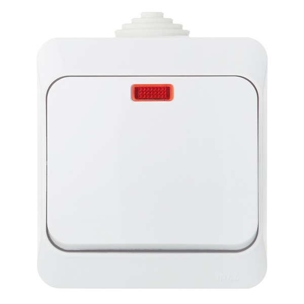 Выключатель Schneider Electric ЭТЮД (белый, открытой установки) одноклавишный, с подсветкой и предназначен для применения в сетях до 250В, на ток до 10А, что делает его легко находимым при отсутствии освещения. Он удобен в применении и отлично подходит для ванной комнаты (IP44). Сделано в России.