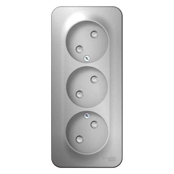 Розетка SE BLANCA (алюминий, открытой установки) трехместная, без заземления, со шторками и изолирующей пластиной предназначена для сетей до 250В, на ток до 16А. Трехместная розетка позволяет подключить три устройства в одном месте. Шторки обеспечат дополнительную безопасность в помещении, где находятся дети.