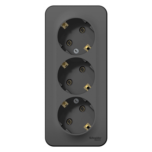 Розетка SE BLANCA (антрацит, открытой установки) трехместная, без шторок, с заземлением и изолирующей пластиной предназначена для сетей до 250В, на ток до 16А. Трехместная розетка позволяет подключить три устройства в одном месте. Заземление обеспечивает безопасность при косвенном прикосновении. Она изготовлена из ABS-пластика, проста в установке и удобна в применении.