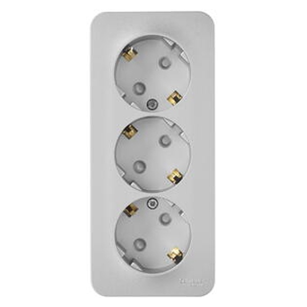 Розетка SE BLANCA (алюминий, открытой установки) трехместная, с заземлением, шторками и изолирующей пластиной предназначена для сетей до 250В, на ток до 16А. Трехместная розетка позволяет подключить три устройства в одном месте. Шторки и заземление обеспечивают дополнительную безопасность при косвенном прикосновении.
