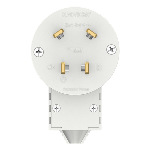 Вилка Schneider Electric BLANCA (белый, скрытой установки) силовая предназначена для применения в сетях до 440В, на ток до 32А. Монтаж выполняется с помощью монтажных лапок и винта. Поверхность имеет глянцевое покрытие. Размеры розетки: 67*104*73 мм.