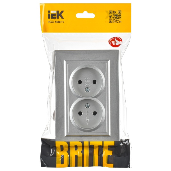 Двухместная двухполюсная электрическая розетка цвета алюминий для скрытого монтажа в одну монтажную коробку, IEK BRITE BR-R20-10-K47-F