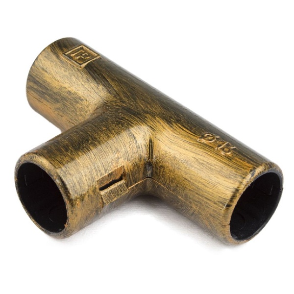 Открытая проводка должна выглядеть эстетично и быть безопасной. С этой целью используются декоративные трубы из ПВХ. Их прокладка выполняется не всегда по прямой линии. Довольно часто возникает необходимость изменить их направление или присоединить к ним дополнительные отводы. На этот случай и предусмотрены такие фитинги, как соединительные тройники. Тройник торговой марки Bironi в цвете бронза представляет собой один из вариантов креплений труб между собой одновременно в трех направлениях. Это тот случай, когда к основной конструкции подключаются дополнительные ответвления. Само изделие сделано из ПВХ и имеет декоративное напыление в ретро стиле. Такой дизайнерский ход продуман с целью оформления интерьеров под старину. Это очень модная тенденция из прошлого, которая гармонично смотрится в интерьерах в стиле эко или лофт. При этом такой вариант является сравнительно бюджетным, в отличие от стальных тройников. Изделие подходит для труб с диаметром 16 мм. Крепление труб производится путем их вставки в отверстия тройника. Получается единая декоративная конструкция, которая стильно дополняет помещение.