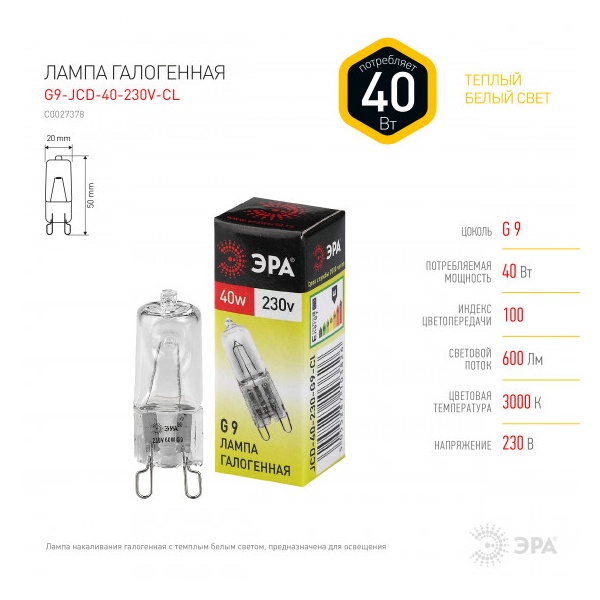 Галогенная капсульная прозрачная лампочка ЭРА с цоколем G9, мощностью 40 Ватт, напряжением 230 Вольт C0027378