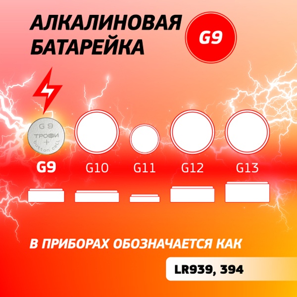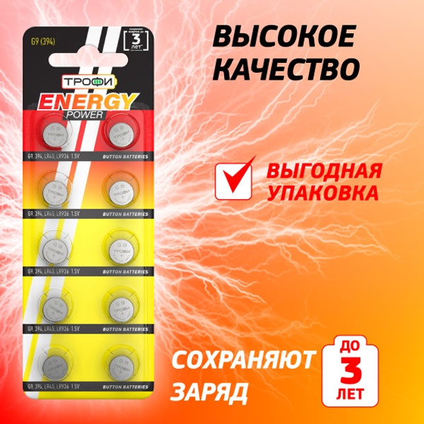 Элемент питания алкалиновый "таблетка" LR936/LR45/G9/394) (блист.10шт) Трофи C0034937