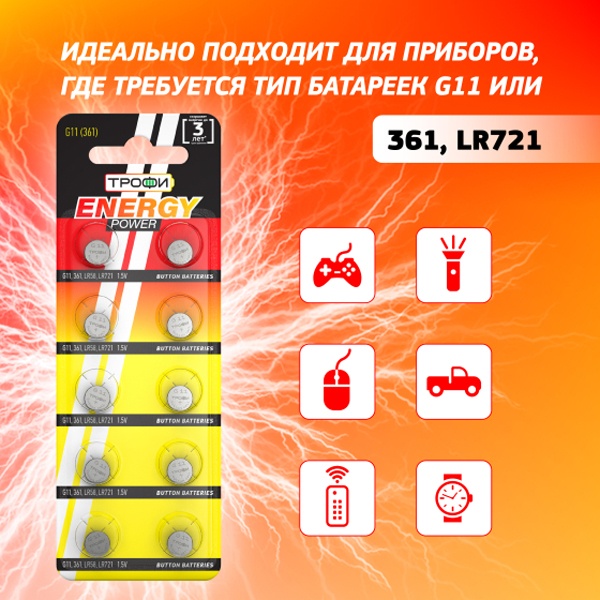 Элемент питания алкалиновый "таблетка" LR721/LR58/G11/361 (блист.10шт) Трофи C0035064