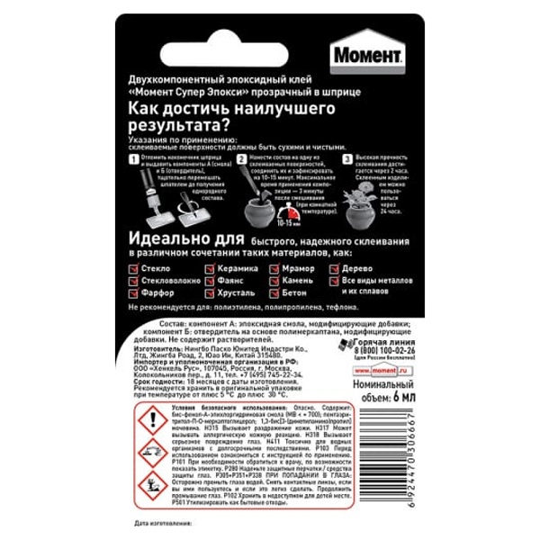 Он не расширяется и не сжимается при отверждении, устойчив к воздействию воды, масел и растворителей. Благодаря удобной упаковке в виде шприца, клей можно точно дозировать и более аккуратно и равномерно наносить на поверхность, что способствует экономичности. Может быть использован как для внутренних, так и внешних работ. После отверждения Момент Супер Эпокси Прозрачный в шприце можно окрашивать, полировать и даже сверлить!