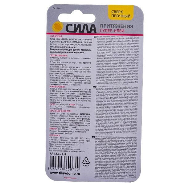 Супер-клей СИЛА, идеально подходит для быстрого и эффективного ремонта различных предметов мебели, интерьера и т.д. Накрепко схватывает дерево, резину, керамику, фарфор и пластик, при этом супер клеи экономично расходуются и высыхают за несколько секунд.