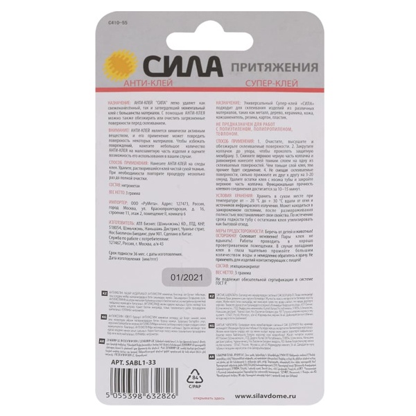 Набор прозрачный клей-секунда и Антиклей СИЛА SABL1-33, объем 3+3 мл. C0039400