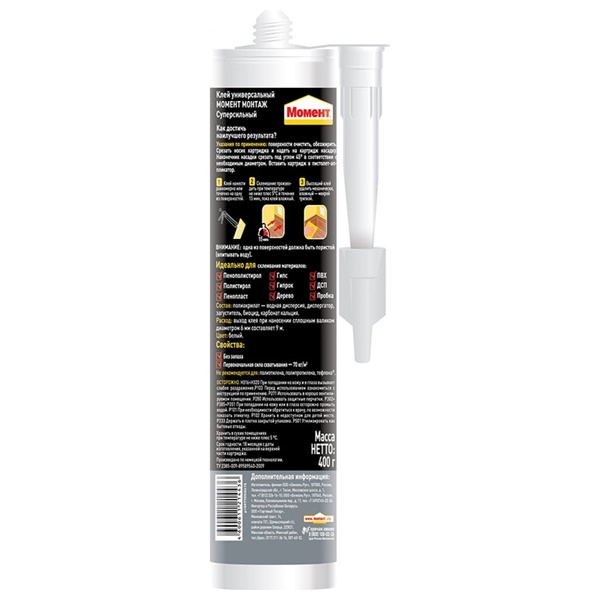 Момент Монтаж Суперсильный МВ-70 белый обладает высокой начальной силой склеивания (70 кг/м2) и отлично подходит для различных ремонтных работ.