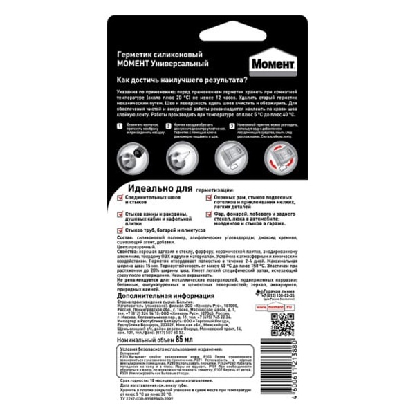 Герметик Силиконовый Универсальный Момент – высококачественный силиконвый герметик. Отлично подходит для широкого спектра работ по герметизации и заполнению швов, соединению поверхностей.