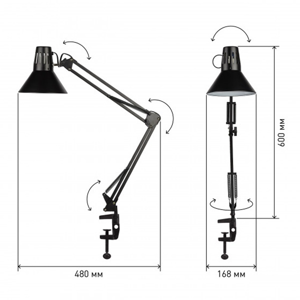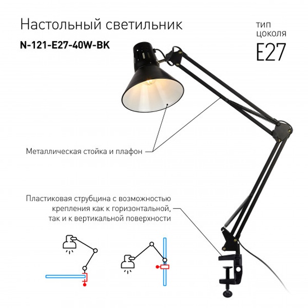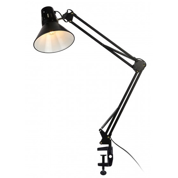 Светильник может использоваться с лампой накаливания, компактной люминесцентной лампой (КЛЛ) или светодиодной (LED) лампой. Надежная пластиковая струбцина для крепления к краю поверхности. Металлические стойка и плафон. Высота плафона регулируется двухсекционной сгибающейся стойкой. Направление света регулируется поворотом и наклоном плафона в любом направлении.