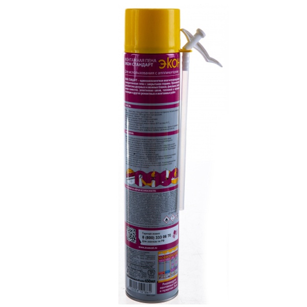 ЭКОН — однокомпонентная влагоотверждаемая полиуретановая пена с закрытыми порами. Применяется для монтажа дверных и оконных блоков, фиксации, заполнения полостей, уплотнения швов, тепловой и звуковой изоляции и других общеремонтных и монтажных работ. Хорошо совместима с большинством строительных материалов: бетоном, кирпичом, камнем, гипсокартоном, ПВХ и другими материалами (кроме силикона, тефлона™, полиэтилена). Выход монтажной пены — до 42 литров (объем готовой пены зависит от влажности воздуха, температуры воздуха, ширины и глубины заполняемой полости).