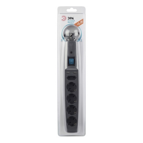 Сетевой фильтр ЭРА SFU-5es-2m-B с надежной защитой с заземлением с выключателем 5 розеток 2м 2xUSB 10А черный