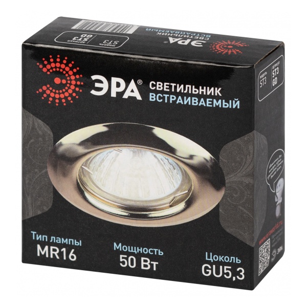 Встраиваемый точечный светильник Эра ST3 под лампы MR16 с цоколем GU5,3 максимальной мощностью 50 Ватт, напряжением 12/220 Вольт, цвет золото C0043802