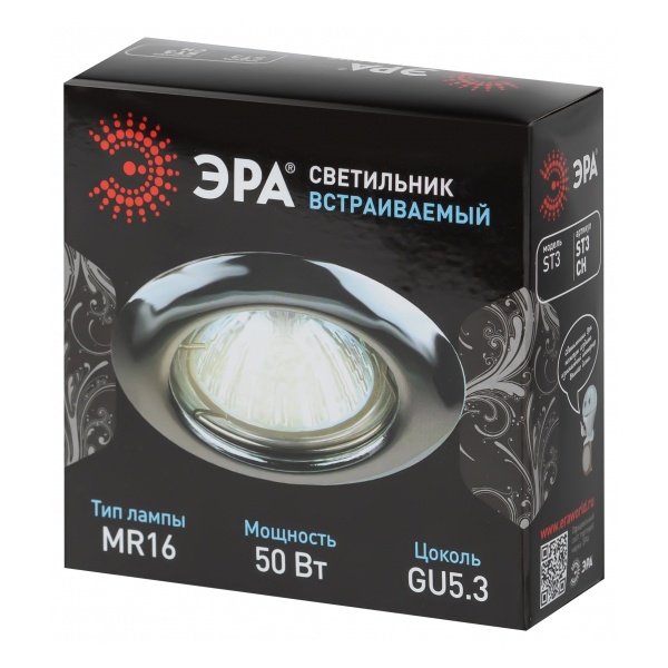Встраиваемый точечный светильник Эра ST3 под лампы MR16 с цоколем GU5,3 максимальной мощностью 50 Ватт, напряжением 12/220 Вольт, цвет хром C0043804