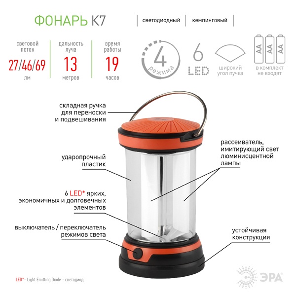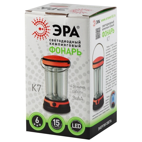 Кемпинговый светодиодный фонарь K7, разработан специально для всех, кому нужен практичный и надёжный источник света на даче или на природе. Фонарь оснащён 6 белыми светодиодами, которые светят очень ярко. Фонарь имеет 3 режима работы: 2/4 и 6 светодиодов. Так что можно выбрать комфортный уровень освещённости. Светодиоды заключены в колбы-отражатели, что не только интересно выглядит с точки зрения дизайна, но и позволяет светодиодам освещать большую площадь. Питается от трёх батареек типа АА и может работать на полной мощности 15 часов. Фонарь оснащён металлической складной ручкой, так что его удобно брать с собой в пешие прогулки или просто переносить с места на место. Также у фонаря устойчивая конструкция, что очень удобно. Такой фонарь станет отличный источником света на природе. Корпус выполнен из ударопрочного пластика, что позволяет не опасаться мелких механических повреждений. Фонарь очень надёжный и практичный. Несколько режимов работы позволяют настроить необходимую яркость и мощность света, а светодиоды LED не перегорают и не требуют замены. К достоинствам фонаря относятся: лёгкий вес, компактный дизайн, надёжная конструкция и качественный свет.