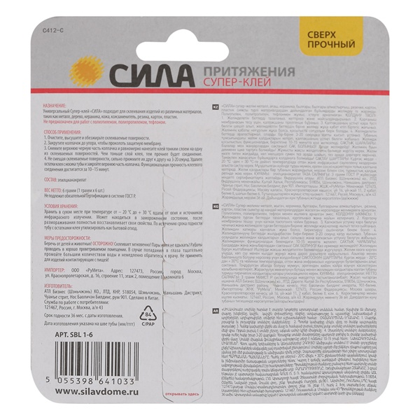 Универсальный прозрачный секундный клей СИЛА SBL1-6, 6*1 гр. C0045533