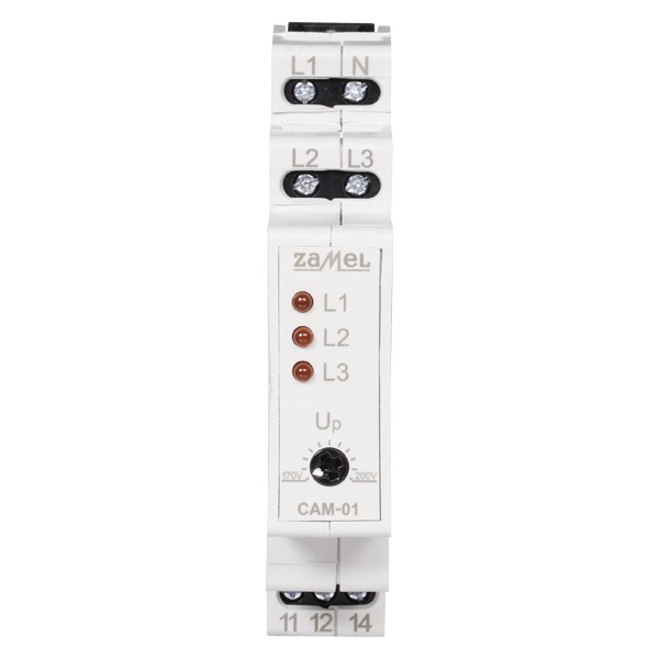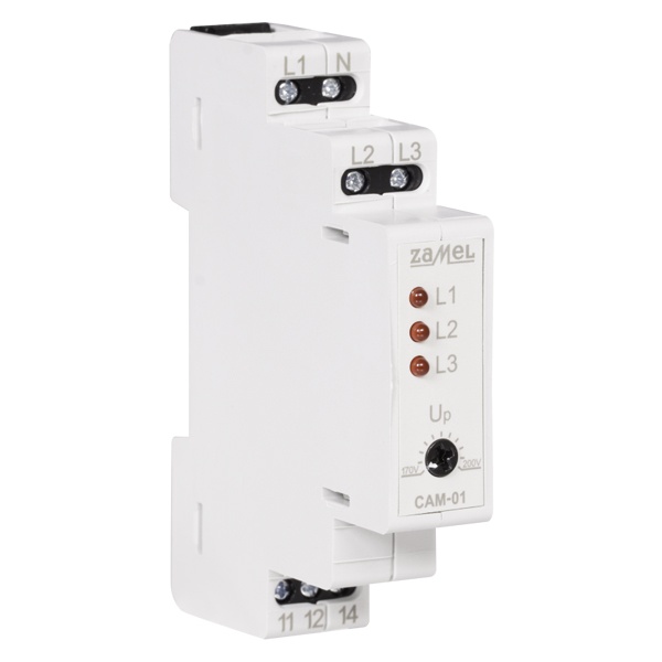 Реле контроля асимметрии напряжения CAM-01 предназначено для защиты устройств, питаемых от трехфазной сети (например, двигатели) от повреждения при исчезновении фазного напряжения или при асимметрии фазных напряжений. Пороговая величина напряжения срабатывания может устанавливаться пользователем при помощи потенциометра. Система не защищает от симметричного падения напряжения. Система питается от фазы L1. Благодаря выключению с задержкой и гистерезису система устойчива к кратковременным колебаниям напряжения.