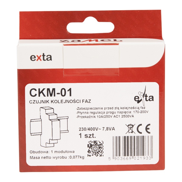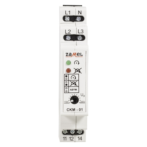 Реле контроля фаз СКМ-01 предназначено для защиты устройств, питаемых от трехфазной сети (например, двигатели) отповреждения в случае исчезновения фазного напряжения, от асимметрии фазных напря-жений или неправильной последовательностью фаз. Пороговая величина напряжениясрабатывания может устанавливаться пользователем при помощи потенциометра. Реле не защищает от симме тричного перепада на-пряжения. Устройство питается от фазы L1. Благодаря выключению с задержкой и гистерезису система устойчива к кратковременным колебаниям напряжения.