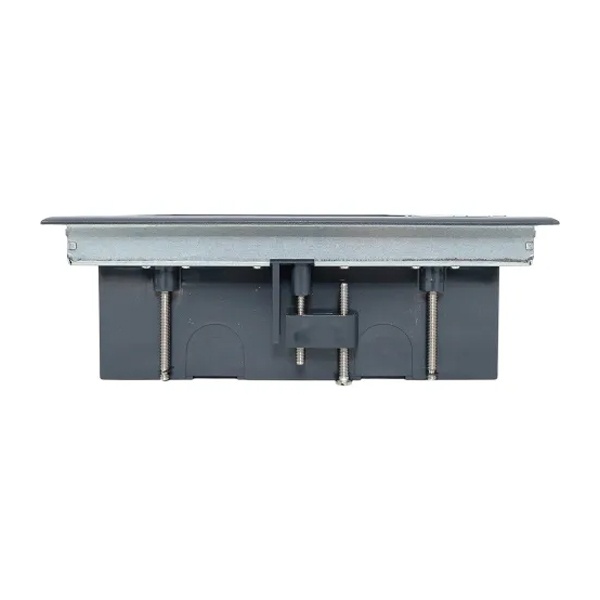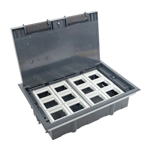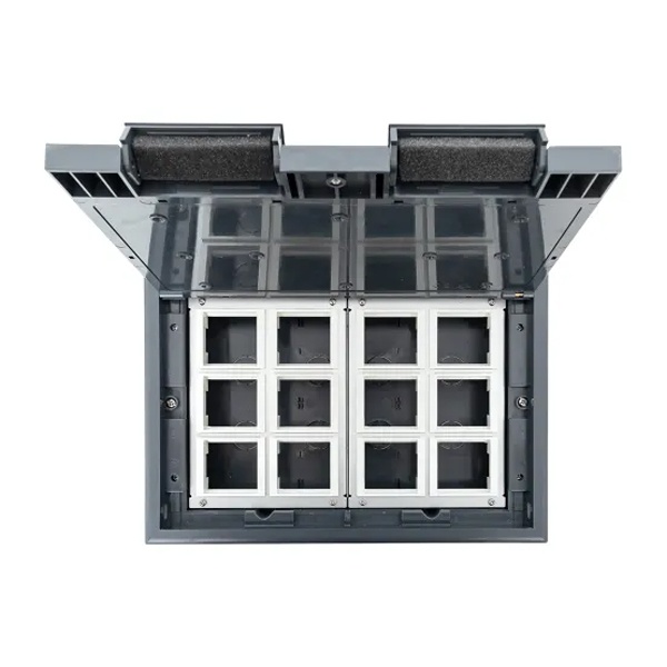 Смысл «изменяемой глубины» в том, что лючок проще подогнать под реальную высоту пола и выбранные механизмы. На практике это экономит время на объекте: не приходится колхозить проставки и ловить крышку, чтобы она нормально закрывалась, когда внутри стоят, например, и силовые розетки, и модульные вставки под слаботочку. Приборная рамка помогает аккуратно собрать модули в единый блок — чтобы не было перекосов и лишних зазоров, которые потом портят вид и мешают закрытию.