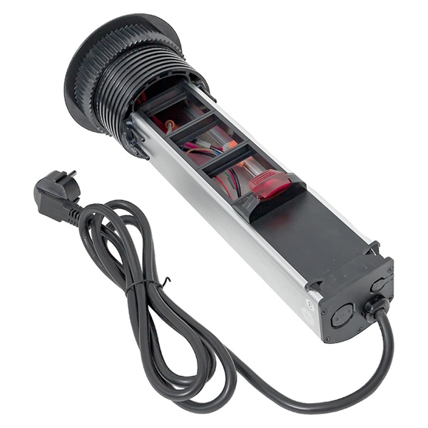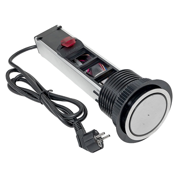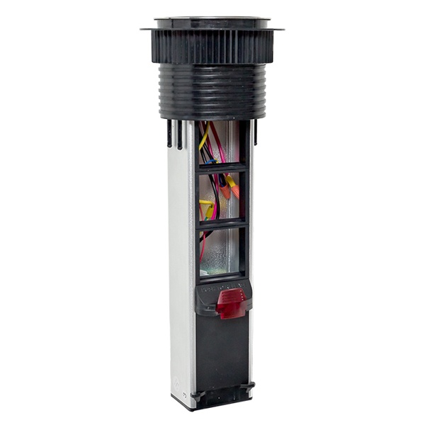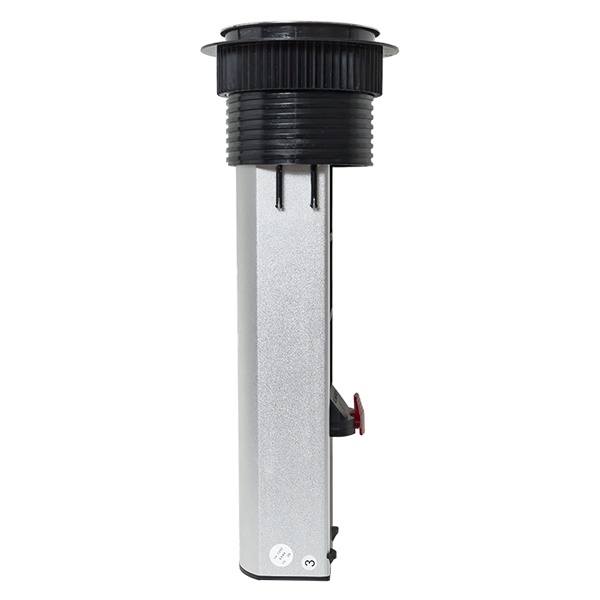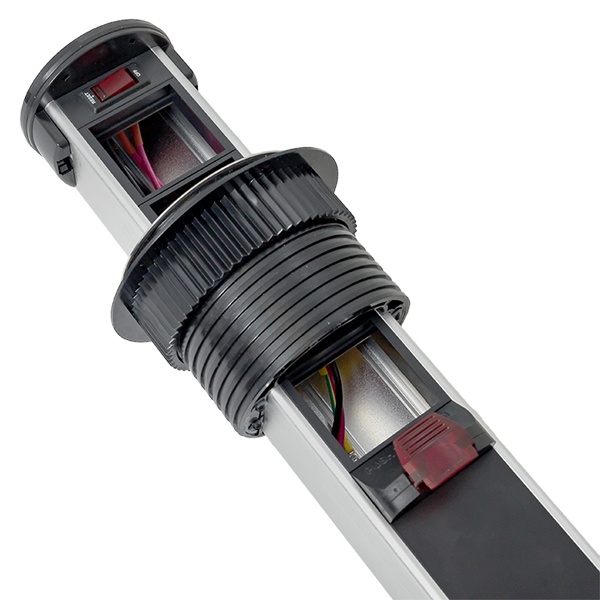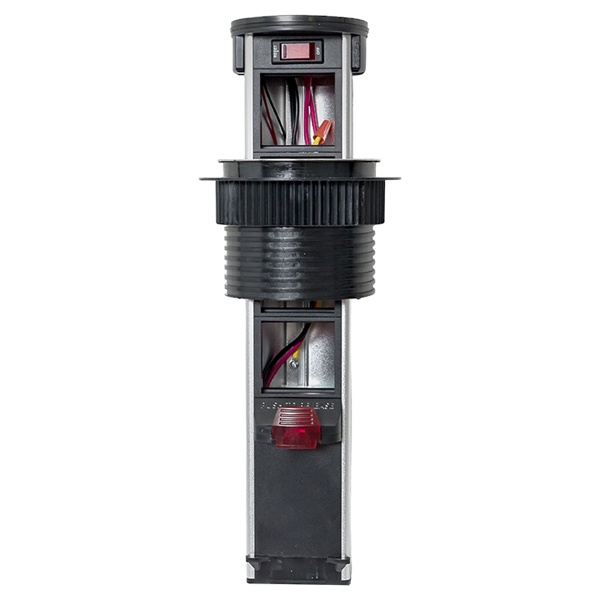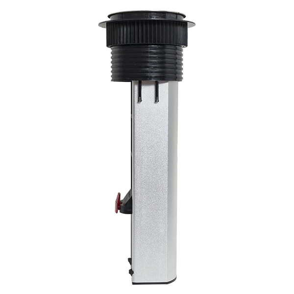 Встраиваемая мини-колонна – это изделие цилиндрической формы с ручным выдвижныммеханизмом. Верхняя крышка колонны оснащена беспроводной зарядкой мощностью 15 Ватт для электронных гаджетов. Беспроводное зарядное устройство считывает данные с контроллера питания подключенного девайса и подбирает оптимальные и безопасные выходные параметры тока и напряжения. В нижней крышке колонны предусмотрены 2 дополнительных кабельных ввода. Монтаж производится в предварительно подготовленное отверстие диаметром 95-100 мм. Допустимая толщинаповерхности стола 10-45 мм.