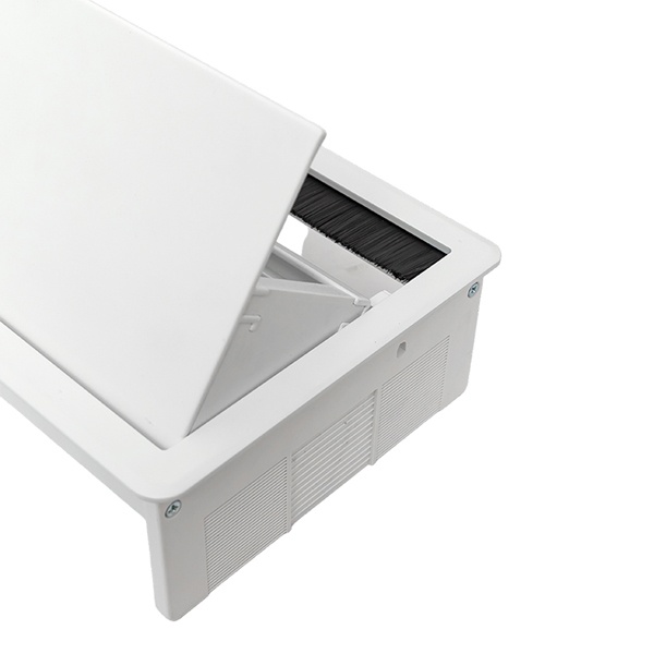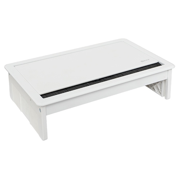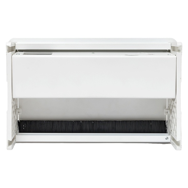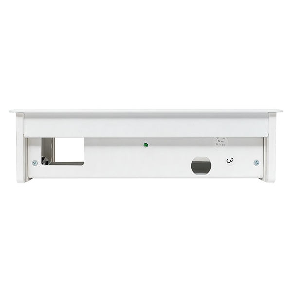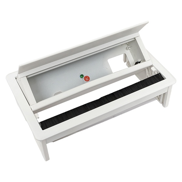 Выдвижной настольный розеточный блок прямоугольной формы с ручным механизмом плавного закрытия, предназначенное для установки модульных ЭУИ. Монтаж производится в предварительно подготовленное отверстие 235х145 мм. Допустимая толщина поверхности стола 10-45 мм.