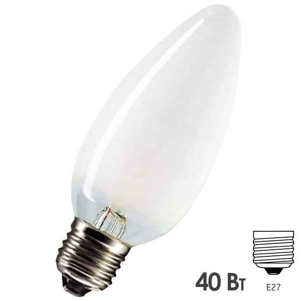 Лампа накаливания OSRAM формы свеча 40Вт. Матовая колба, цоколь Е27. Лицензиатом торговой марки OSRAM в общем освещении является компания LEDVANCE.