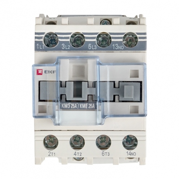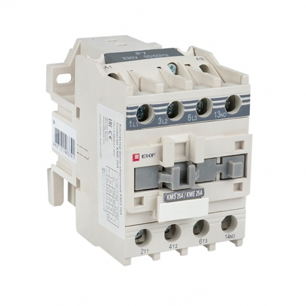 Контактор серии КМЭ от компании EKF Proxima представляет собой малогабаритный коммутационный агрегат, который служит для пуска и отключения, без предварительной остановки, двигателей с короткозамкнутым ротором, а также для коммутации неиндуктивных или слабо индуктивных нагрузок. Это практичное устройство, которое позволяет управлять нагрузкой в цепи переменного тока частотой 50/60 Герц с напряжением до 660 Вольт. Напряжение цепи управления – 220 Вольт. Оно подходит для категории применения АС 3 и АС 1. Аппарат состоит из корпуса, закрепленных в нем неподвижных и подвижных контактов, которые зафиксированы в подвижной части магнитной системы. При подаче напряжения на катушку управления контактора возникает магнитное поле, которое, преодолевая сопротивление пружины, замыкает контакты. В обратном случае контакты размыкаются. Корпус защищает от случайного касания к токоведущим частям. Данная модель рассчитана на номинальный рабочий ток в 25 Ампер и оснащена 1 группой дополнительных контактов (нормально открытыми). Прибор предназначен для подсоединения как алюминиевым, так и медным проводом. Крепление осуществляется на ДИН-рейку или винтовым способом на монтажную панель. Достоинствами аппарата серии КМЭ являются высокая коммутационная стойкость и наличие маркировки для идентификации контактора в щите. Габариты: 56х93х84 мм.