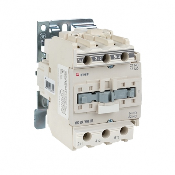 Малогабаритный контактор серии КМЭ от производителя EKF PROxima представляет собой коммутационное устройство общепромышленного применения для пуска, остановки и реверсирования асинхронных электродвигателей с короткозамкнутым ротором в сети переменного тока до 660 Вольт с категорией применения АС-3. Также оно служит для дистанционного управления нагревательными цепями и цепями освещения с категорией применения АС-1. Модель номинальным током нагрузки до 50 Ампер рассчитана на напряжение питания цепи управления 380 Вольт и имеет две группы дополнительных контактов (1НО и 1НЗ). С целью увеличения токопроводности и надежности соединения дополнительный контакт выполнен с рифленой поверхностью. Контактор КМЭ состоит из термостойкого корпуса, электромагнитной, дугогасительной и контактной систем. При отсутствии напряжения в цепи контакты находятся в разомкнутом состоянии, при подаче напряжения на катушку образуется магнитное поле, которое преодолевает сопротивление пружины и замыкает контакты. Мостиковые контакты обеспечивают надежный разрыв цепи. Присоединение контактора возможно алюминиевым и медным проводником. Крепление допустимо на дин-рейку или с помощью винтов на монтажную плату. Маркировочная площадка позволяет с легкостью идентифицировать контактор в щитке. Высокая коммутационная стойкость обеспечивает продолжительный срок службы. Размеры: 74х114х127 мм.