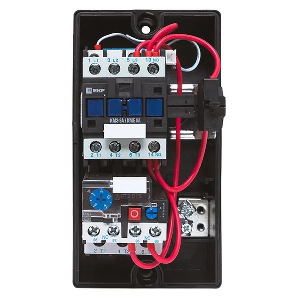 Магнитный пускатель КМЭ серии EKF PROxima представляет собой полностью укомплектованное устройство, включающее малогабаритный контактор КМЭ, тепловое реле РТЭ, корпус с сальниками для ввода кабелей и кнопки управления. Это оборудование предназначено для дистанционного управления запуском и остановкой трехфазных асинхронных электродвигателей с короткозамкнутым ротором при переменном напряжении до 400 В. Пускатели эффективно защищают электродвигатели от длительных перегрузок и сверхтоков, которые могут возникать, например, при обрыве одной из фаз, обеспечивая надежность и безопасность работы оборудования.