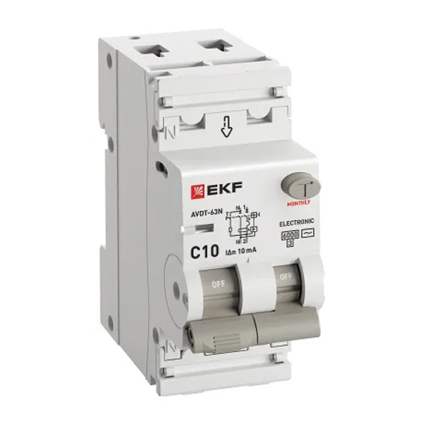 • Дифавтомат EKF PROxima АВДТ-63N 1P+N C10А 10мА тип АС однофазный электронный 6кА (дифференциальный автомат, АВДТ)