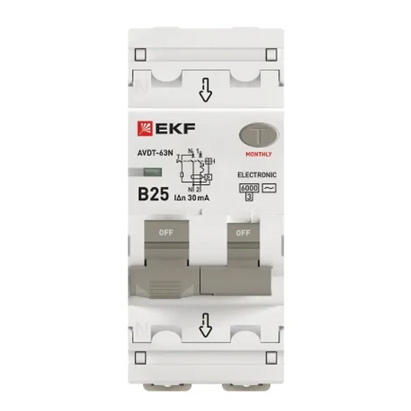 • Дифавтомат EKF PROxima АВДТ-63N 1P+N B25А 30мА тип АС однофазный электронный 6кА (дифференциальный автомат, АВДТ)