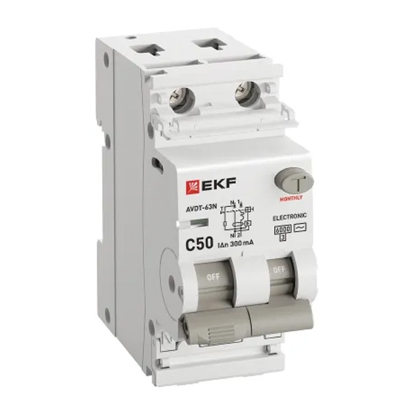 • Дифавтомат EKF PROxima АВДТ-63N 1P+N C50А 300мА тип АС однофазный электронный 6кА (дифференциальный автомат, АВДТ)