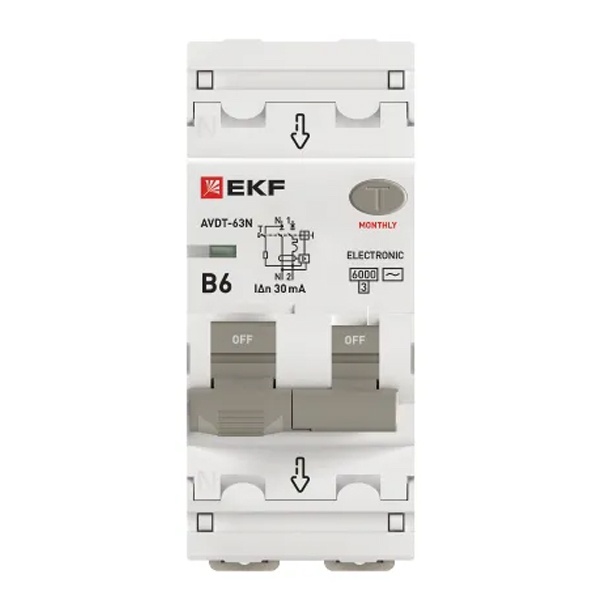 • Дифавтомат EKF PROxima АВДТ-63N 1P+N B6А 30мА тип АС однофазный электронный 6кА (дифференциальный автомат, АВДТ)