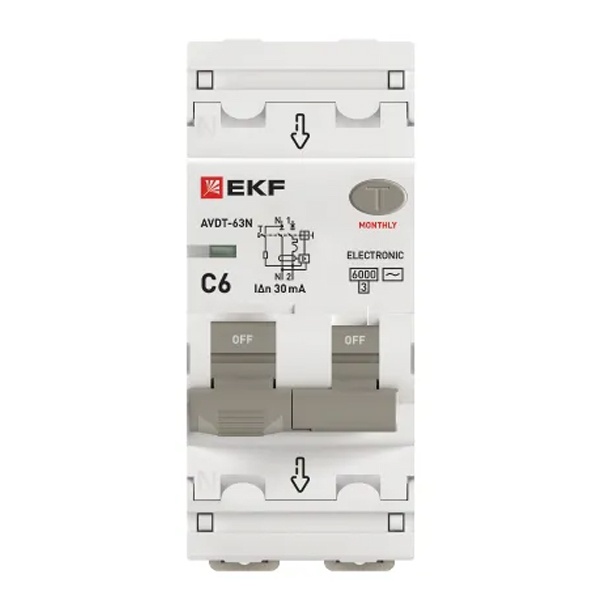 • Дифавтомат EKF PROxima АВДТ-63N 1P+N C6А 30мА тип АС однофазный электронный 6кА (дифференциальный автомат, АВДТ)