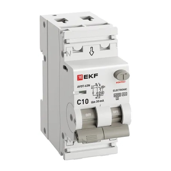 • Дифавтомат EKF PROxima АВДТ-63N 1P+N C10А 30мА тип А однофазный электронный 6кА (дифференциальный автомат, АВДТ)