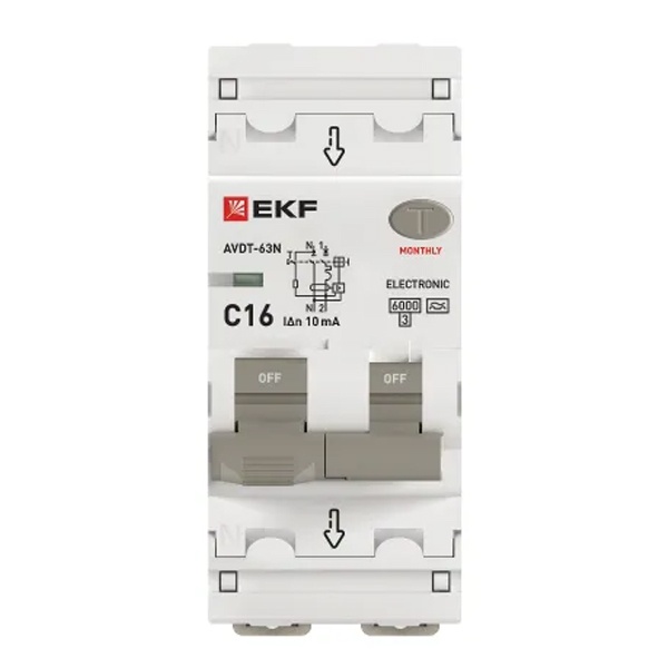 • Дифавтомат EKF PROxima АВДТ-63N 1P+N C16А 10мА тип А однофазный электронный 6кА (дифференциальный автомат, АВДТ)