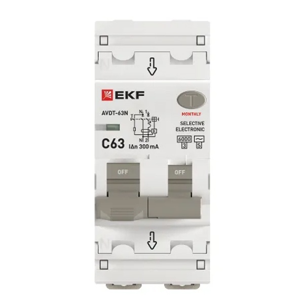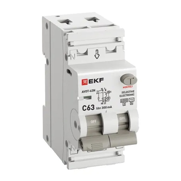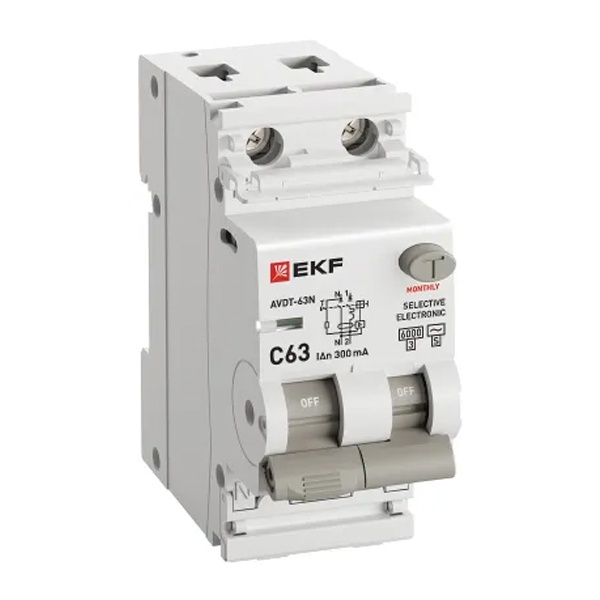 • Дифавтомат EKF PROxima АВДТ-63N (S) 1P+N C63А 300мА тип АС однофазный селективный электронный 6кА (дифференциальный автомат, АВДТ)