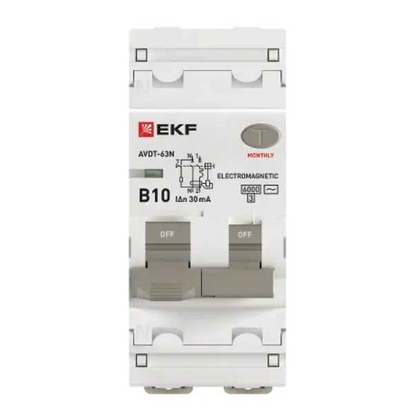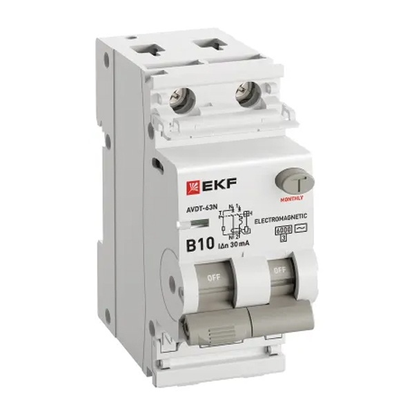 • Дифавтомат EKF PROxima АВДТ-63N 1P+N B10А 30мА тип АС однофазный электромеханический 6кА (дифференциальный автомат, АВДТ)