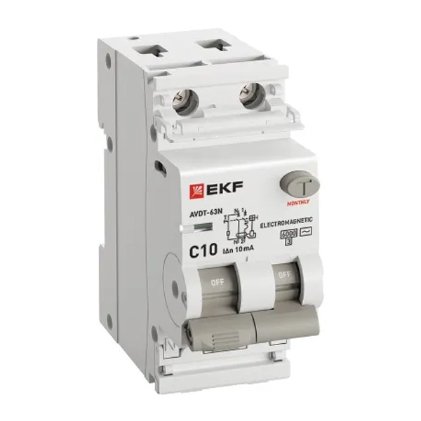 • Дифавтомат EKF PROxima АВДТ-63N 1P+N C10А 10мА тип АС однофазный электромеханический 6кА (дифференциальный автомат, АВДТ)