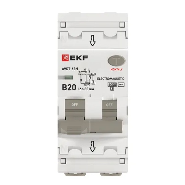 • Дифавтомат EKF PROxima АВДТ-63N 1P+N B20А 30мА тип АС однофазный электромеханический 6кА (дифференциальный автомат, АВДТ)