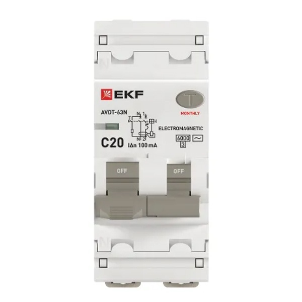 Дифавтомат EKF PROxima АВДТ-63N 1P+N C20А 100мА тип АС однофазный электромеханический 6кА (дифференциальный автомат, АВДТ) D63N26M20C100