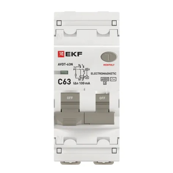 • Дифавтомат EKF PROxima АВДТ-63N 1P+N C63А 100мА тип АС однофазный электромеханический 6кА (дифференциальный автомат, АВДТ)