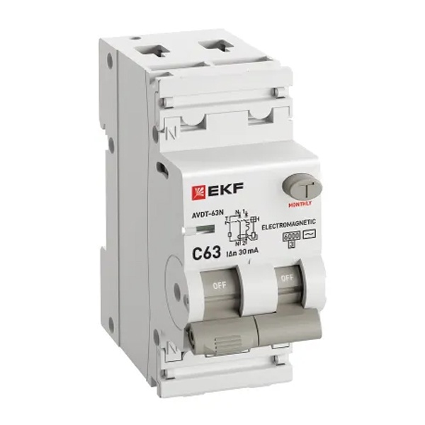 • Дифавтомат EKF PROxima АВДТ-63N 1P+N C63А 30мА тип АС однофазный электромеханический 6кА (дифференциальный автомат, АВДТ)