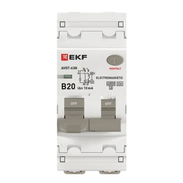 • Дифавтомат EKF PROxima АВДТ-63N 1P+N B20А 10мА тип А однофазный электромеханический 6кА (дифференциальный автомат, АВДТ)