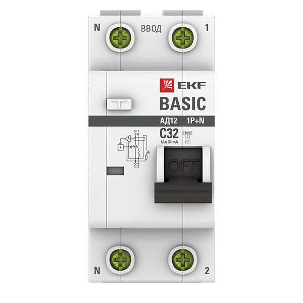 • Дифференциальный автомат EKF Basic АД-12 1P+N C32А 30мА тип АС однофазный электронный 4,5кА (дифавтомат, АВДТ)