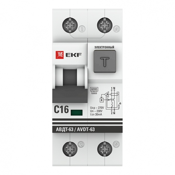 • Дифференциальный автомат EKF PROxima АВДТ-63 1P+N C16А 30мА тип А однофазный электронный 6кА (дифавтомат, АВДТ)