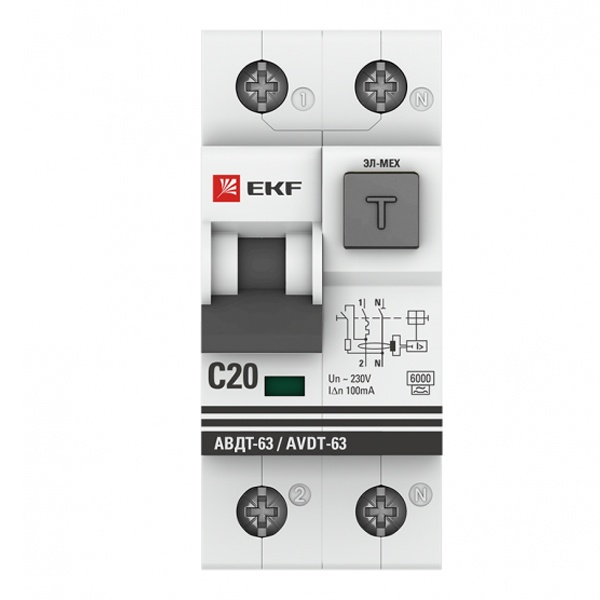 Модель АВДТ со встроенной защитой от сверхтоков относится к серии модульных аппаратов АВДТ-63 PROxima от компании EKF и представляет собой компактное устройство шириной 2 модуля с 2-мя полюсами 1P+N. Оно обладает отключающей способностью в 6000 Ампер, уставкой типа C и чувствительностью в 100 мА. Аппарат относится к классу A и используется для защиты от импульсного и синусоидального тока утечки, возникающих при эксплуатации бытовых электроприборов. Он создан для предотвращения возникновения возгорания под воздействием тока утечки. Автоматический выключатель дифференциального тока рассчитан на работу в 1-фазных сетях и на нагрузку тока в 20 Ампер. Допустимое рабочее напряжение составляет 230 Вольт. Он сочетает функции автоматического выключателя и УЗО и обеспечивает 3 вида защиты: от короткого замыкания, перегрузки и утечки тока. На лицевой панели имеется тестовая кнопка для регулярной проверки работоспособности, эргономичный рычаг управления с 2-мя положениями и индикация срабатывания в случае возникновения тока утечки, КЗ или перегрузки. Областью применения выступают распределительные щиты небольших коммерческих и жилых зданий. Габаритные параметры: ширина – 35,6 мм, высота – 81,5 мм, глубина – 72 мм.